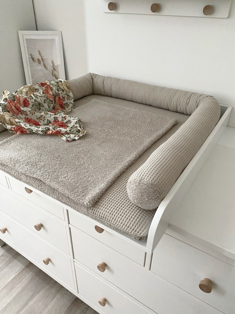 Der Bezug für die Wickelauflage wird außen mit einem Waffelstoff genäht, innen mit Frotteeteil. So musst du im Fall einer Verschmutzung nur den Bezug waschen (oder im besten Fall auch nur die extra Frotteeauflage, die zusätzlich bestellt werden kann und mit Druckknöpfen angebracht wird) und nicht die komplette Auflage.